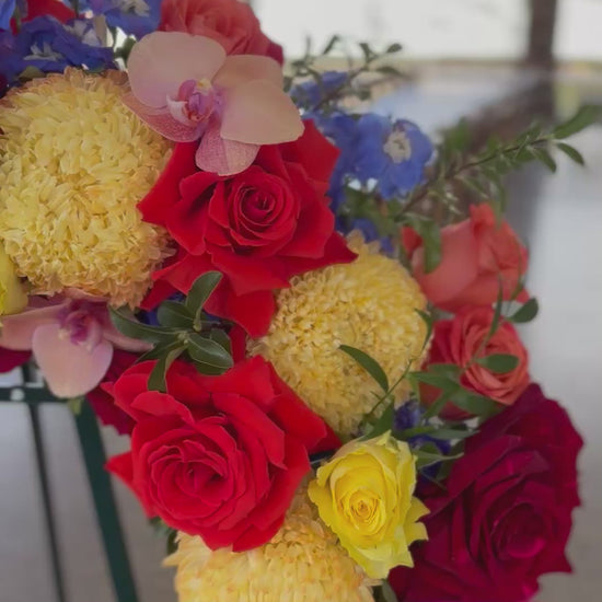 Made with a vibrant mix of roses, disbud chrysanthemums, orchids & seasonal flowers.