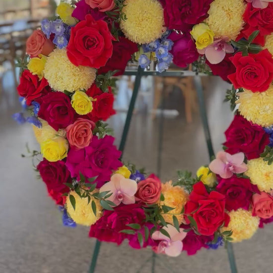 Celebrate a life filled with love and joy with our bright funeral wreath, a heartfelt tribute designed to honour treasured memories. Featuring a vibrant mix of roses, chrysanthemums, orchids, and seasonal blooms in rich, uplifting colours, this wreath symbolises strength, love, and a life beautifully lived.