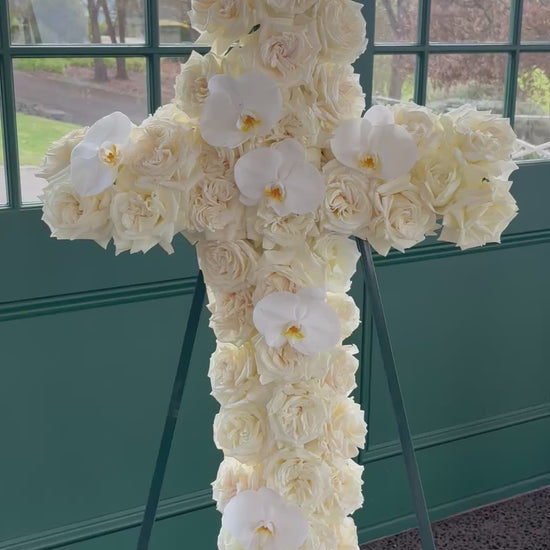 Perfect for funeral or memorial services, the cross wreath provides a meaningful expression of sympathy, offering comfort and solace to grieving family and friends. Its elegant design serves as a beautiful way to honour a cherished life while conveying messages of love, hope, and peace.